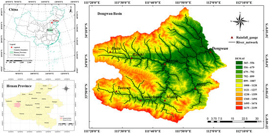 Location map of the Dongwan catchment. The upper left plot shows the location of Henan Province in China, the lower left plot shows the location of the Dongwan Basin in Henan Province, and the right plot is the DEM (digital elevation model) map of the Dongwan Basin.