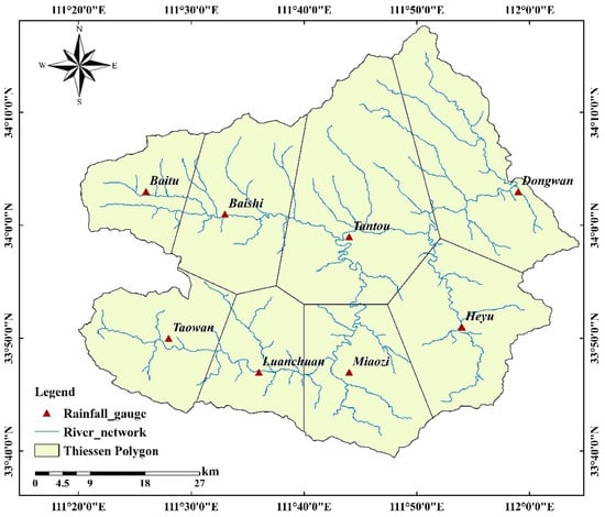 This study utilized 90 m resolution digital elevation model (DEM) terrain data provided by HYDROSHEDS [] to extract the catchment above the Dongwan station. In data processing, Arcview 3.2 was employed for tasks such as watershed extraction, river network generation, and sub-watershed delineation within the study area. The research watershed was divided into eight sub-watersheds using Thiessen polygons, as illustrated in Figure 2. The study area contains eight rainfall stations: Taowan, Luanchuan, Miaozi, Baishi, Baitu, Tantou, Heyu, and Dongwan. The rainfall stations are listed in Table 1. Daily rainfall data from 1961 to 2000 (excluding the missing data from 1969) were extracted for modeling, along with observed flow data from the Dongwan station of the same period, to conduct daily model simulations and forecasts.