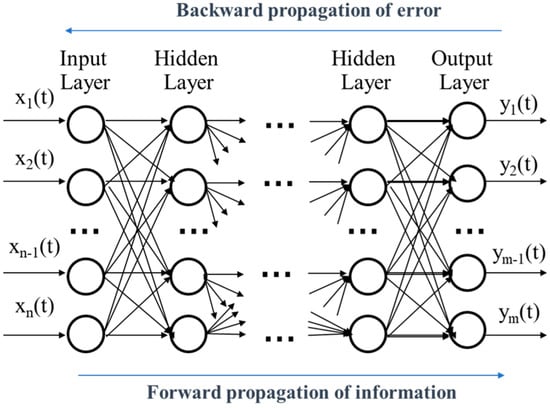 The topological structure of the BP neural network model consists of an input layer, multiple hidden layers, and an output layer. Based on the number of hidden layers, the BP neural network can be divided into single-hidden-layer and multi-hidden-layer networks. Studies have shown that compared to a single hidden layer, a multi-hidden-layer BP (MBP) network has stronger generalization capability and higher prediction accuracy. For complex mapping relationships, increasing the number of hidden layers can significantly improve the network’s forecasting accuracy [,]. The schematic diagram of the structure of the MBP model is demonstrated in Figure 4. The training and learning process of the BP neural network consists of two stages: forward propagation of information flow and backward propagation of error signals. First, input information is propagated layer by layer from the input layer through the hidden layers, with each layer of neuron states only affecting the next layer of neurons. It finally reaches the output layer, and the error value is calculated. If the error value does not meet the convergence criterion, it enters the backward propagation stage, where the error is propagated back along the original path, and the partial derivatives of the error with respect to the weights of each neuron are calculated. These derivatives serve as the basis for modifying the weights of each neuron. The process of forward and backward propagation is repeated until the error meets the criterion, concluding the learning process of the BP neural network.