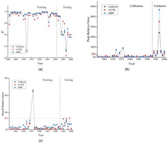 Comparison of the training and testing of evaluation indicators in 1961–2000. (a) R2; (b) peak relative error; (c) runoff relative error.