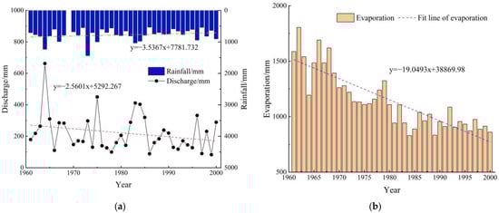Linear trends in hydro-meteorological variables in the Dongwan watershed. (a) Rainfall and runoff; (b) evaporation.
