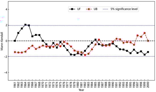 The change point detection statistic values UF and UB for the series variables indicate an upward or downward trend in the data series, and exceeding the significance level suggests a significant change in the trend. If UF and UB intersect within the significance level, the point is considered a change point, dividing the series variables into a baseline period and a changing period.