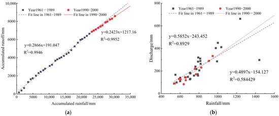 Additionally, the rainfall–runoff relationship curves for the periods 1961–1989 and 1990–2000 were separately plotted, as shown in Figure 8b. It was found that the fitting lines for the two groups of data points deviated to some extent. The linear fit determination coefficient R2 was 0.5844 for the period 1961–1989 and 0.8929 for the period 1990–2000, indicating a change in the correlation between rainfall and runoff before and after the abrupt change point.