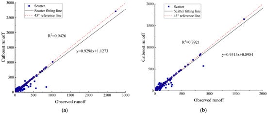 Scatter plot of observed and predicted runoff for the CatBoost model. (a) Training; (b) testing.