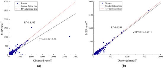 Scatter plot of observed and predicted runoff for the MBP model. (a) Training; (b) testing.