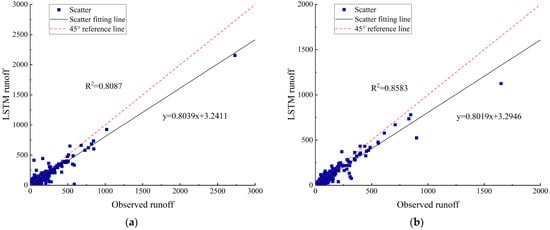 Scatter plot of observed and predicted runoff for the LSTM model. (a) Training; (b) testing.
