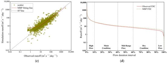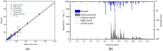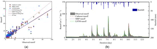 Figure 14a, Figure 15a and Figure 16a reveal that during the training period, the observed and simulated runoff points of CatBoost, MBP, and LSTM models are concentrated around the 45° line, indicating a linear relationship between observed and simulated daily runoff. The larger the flow, the more concentrated the points, indicating a stronger linear relationship. Figure 14c, Figure 15c and Figure 16c show that during the testing period, the observed and simulated runoff points of CatBoost and LSTM models are concentrated around the 45° line when the flow exceeds 10 m3·s−1·d−1, indicating a better linear relationship for flows greater than 10 m3·s−1·d−1. The observed and simulated runoff points of the MBP model are concentrated around the 45° line, indicating a higher linear relationship compared to the CatBoost and LSTM models.