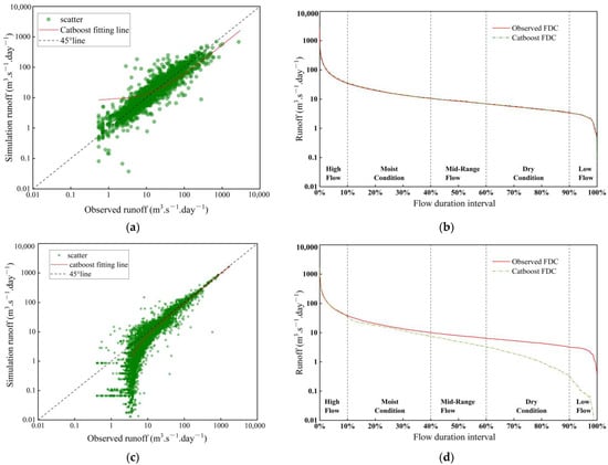 To further investigate the performance of machine learning models in dealing with non-stationary datasets, the entire rainfall–runoff dataset for the years 1961–2000 was divided into training and testing sets, with even-numbered years assigned to training and odd-numbered years to testing. CatBoost, MBP, and LSTM models were employed for simulation. The simulation evaluation results are presented in Table 6. The linear relationship between observed and simulated daily runoff and the flow duration curves (FDCs) are depicted in Figure 14, Figure 15 and Figure 16. Figure 14a,c, Figure 15a,c and Figure 16a,c show the linear relationship between observed and simulated daily runoff during the calibration and validation periods, while Figure 14b,d, Figure 15b,d and Figure 16b,d present the FDCs during the calibration and validation periods.