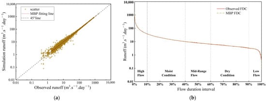 The FDC for daily runoff simulation can be divided into five intervals: [0, 10%], [10%, 40%], [40%, 60%], [60%, 90%], and [90%, 100%]. These intervals correspond to high flow, wet conditions, moderate flow, dry conditions, and low flow, respectively [].
