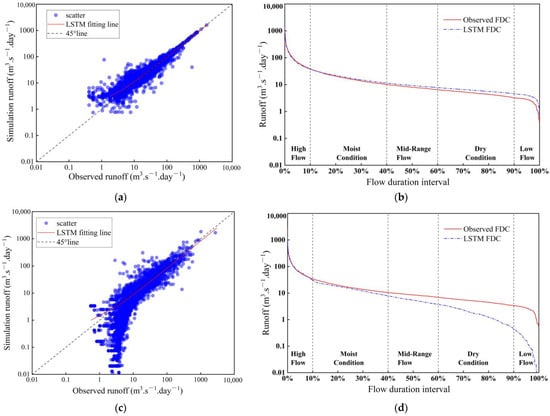 Comparison of observed and simulation runoff by LSTM model; (a) scatter plot between observed and simulation runoff in training dataset; (b) flow duration curve of the observed and simulation runoff in training dataset; (c) scatter plot between observed and simulation runoff in testing dataset; (d) flow duration curve of the observed and simulation runoff in testing dataset.