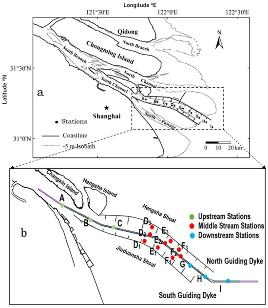 (a) General layout of the Yangtze Estuary; (b) location of the sampling stations in the channel.
