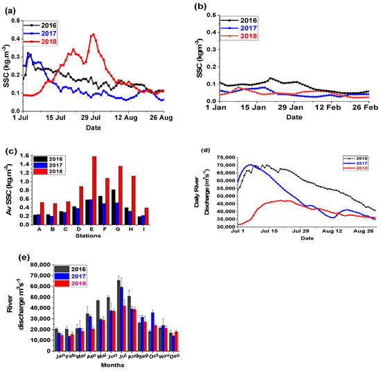 For the three years, (a) averaged SSC and (b) current velocity in spring tide, (c) depth averaged SSC per station, (d) daily mean averaged discharge in wet season (e) monthly averaged discharge.