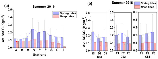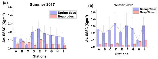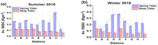 Spring tides exhibited a greater number of fluctuations in SSSC compared to neap tides, irrespective of the year and season (Figure 3, Figure 4 and Figure 5). The highest range of variation (0.28) in along-channel SSSC (0.12 to 0.40 kgm−3, as shown in Figure 5a) was seen during spring tides, which was three times more than the highest range of variation (0.09) reported during neap tide (0.04 to 0.13 kgm−3, as shown in Figure 5b). Similarly, the highest average SSSC measured along the channel during spring tide in winter 2017 was 0.25 kgm−3, about three times more than the figure of 0.09 kgm−3 seen during neap tides in the summer of 2018.