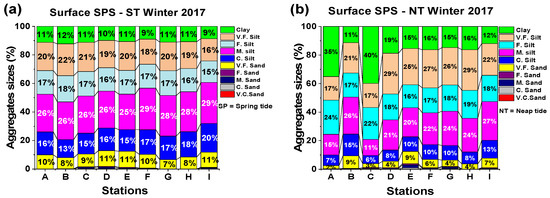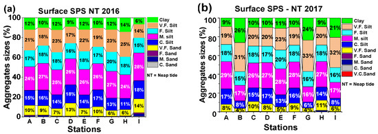 Generally, less variation was observed in the averaged D50 of surface sediments in 2016 values compared to 2017. To be precise, while there was less variation of surface averaged D50 between spring and neap tides in 2016, the variation gap was large at several stations in 2017. For instance, in 2016, apart from station I, where the difference of the averaged D50 between spring and neap tides was 5 µm (7–12 µm), the largest averaged D50 difference recorded all along the stations was 2 µm (Figure 8a). Similarly, in 2017, apart from station B with a large difference averaged D50 of 5 µm (5.1–10.1 µm), the variation gap between spring and neap tides was larger than 2 µm at several stations, A (i.e., 7 µm in neap tide and 10.5 µm in spring tide), F (i.e., 7.1 µm in neap tide and 10.8 µm in spring tide) and H (i.e., 6 µm in neap tide and 8.4 µm in spring tide), (Figure 9a). The lower variation in SPS between neap and spring tides in 2016 could be explained firstly by the discharge difference and secondly by the current velocity during these two tidal periods. From spring to neap, the surface current velocity is quite the same, and this behavior of the surface flow can be backed up by the water discharge, which is less variant during the same period. However, the trend is different in 2017, the surface flow and the water discharge clearly reduced from spring to neap. The input of surface flow velocity on SPS is more visible when it comes to tides. In summer, aggregate variations and distributions are dominant during the ebb and LSW along the channel from upstream to downstream, whether spring or neap tides (Figure 10a and Figure 11a). However, the trend is different in winter 2017 (Figure 10c and Figure 11c) for both spring and neap tides. There seems to be a balance in aggregate variations and distributions between landward flow direction (flood and HSW) and seaward flow direction (ebb and LSW). Nevertheless, the variation in aggregates appears to be controlled by the phase of the tide. For instance, in winter aggregates, variations increased according to the flow direction. It increased in the landward direction during flood and HSW and in the seaward direction during ebb and LSW. The combined effect of the turbulent forces created by the motion of the water current during ebb and flood, together with the decreasing flow motion during HSW and LSW, seems to be responsible for these tide-induced aggregate variations [48,58]. In the spring tides of winter 2017, as presented in Figure 11c, aggregates increased seaward for both combinations. In this case, the turbulent forces of upstream flow dominated because the flood season dominated the tidal current flowing upstream.