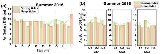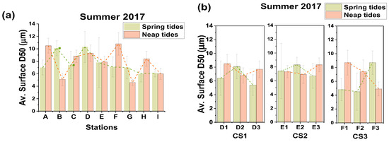 | Stations | Averaged Surface D50 (µm) 2017 Spring Tides | STD | Averaged Surface D50 (µm) 2017 Neap Tides | STD |