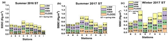 The highest average range during the summer of 2016 (0.17, Figure 10a, with a flooding range of 0.04–0.21 kgm−3), the summer of 2017 (0.22, Figure 10b at low slack water, with a range of 0.08–0.30 kgm−3), and the winter of 2017 (0.46, Figure 10c at ebb, with a range of 0.15–0.61 kgm−3), all occurred during spring tides. Similarly, the highest SSSC (surface suspended sediment concentration) values for summer 2016 (0.23 kgm−3 Figure 10a), summer 2017 (0.30 kgm−3 Figure 10b), and winter 2017 (0.61 kgm−3 Figure 10c) were seen during spring tides. In 2017 (Figure 10b), the highest SSSC values were recorded at ebb tide, mostly at upstream and middle stream stations C and D. Additionally, elevated SSSC values were found during low slack water (LSW), mainly at downstream and middle stream stations G, F, and E. Lastly, increased SSSC values were also noted under flood conditions at station D. The middle channel saw the highest values of SSSC at spring tides (D, E, and F) at LSW in 2016, as shown in Figure 10a.