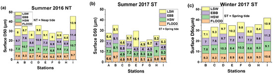 The winter season exhibited the highest surface particle size, measuring 11.3 µm, and the largest average range measuring 4.3 µm, during spring tides at ebb, as seen in Figure 11c. In the summer of 2016, the neap tides at LSW had the largest surface particle size (specifically, 13.9 µm at station I) and an average range of 7.4 µm (as shown in Figure 11a). In 2017, the spring tides at LSW had the largest surface particle size (specifically, 15.1 µm at station E) and the largest average range of 10.5 µm (as shown in Figure 11b).