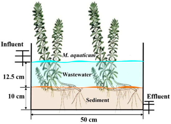 The experiment was conducted in a shelter at the Changsha Research Station for Agricultural & Environmental Monitoring of the Chinese Academy of Sciences to ensure the necessary light and temperature conditions while avoiding the effects of rainfall and other environmental factors. Crates with a length, width, and height of 50 × 32 × 30 cm were used to simulate SFCWs. The main substrate used was red soil with a pH of 5.85, TN content of 0.21 g·kg−1, TP content of 0.25 g·kg−1, and soil organic carbon (SOC) content of 2.24 g·kg−1. The substrate depth was approximately 10 cm, and each CW was planted with 500 g (fresh weight) of 20 cm long M. aquaticum. The schematic diagram of an M. aquaticum SFCW is shown in Figure 1.