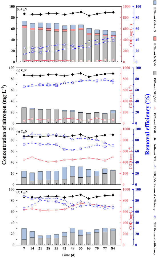 The main nitrogen removal pathways in CWs are microbial nitrification and heterotrophic denitrification, and the influent C/N ratio plays a crucial role in these pathways [13]. As the influent C/N ratio increased, the -N and TN removal rates in CWs also increased from 33.0 ± 1.9% and 25.7 ± 2.1% to 82.6 ± 2.1% and 73.1 ± 1.1%, respectively. This suggests that adding a carbon source to adjust the C/N ratio can effectively enhance nitrogen removal in CWs [25,26]. The effluent of C0N had a noticeable buildup of -N (3.27 ± 0.17 mg·L−1), which was attributed to the lack of organic carbon inhibiting denitrification [27]. Increasing the C/N ratio to 5:1 significantly reduced the accumulation of -N and improved TN removal. However, after the C/N ratio exceeded 5:1, there was no significant difference in TN removal among treatments, and TN removal even showed a slight decrease. This may be because, at this point, the DO level is more favorable for microbial nitrogen transformation than the availability of carbon sources [9]. Higher C/N ratios (10:1 and 15:1) were accompanied by lower DO levels (<2.0 mg·L−1) (Table S2), and this excess of organic carbon in CWs led to an overconsumption of DO, ultimately limiting the rate of nitrification and negatively impacting TN removal. For C0N, the effluent COD concentration was higher than the influent concentration, potentially due to the release of root secretions from wetland plants [28]. Our study found that the optimum influent C/N ratio for pollutant removal in M. aquaticum SFCWs was 5, resulting in the highest TN (73.17%) and COD (72.78%) removal, which is similar to the optimum C/N ratio for horizontal submerged CWs vegetated with Phragmites australis and Calamagrostis angustifolia [29]. Regarding the optimal C/N ratio for pollutant removal in constructed wetlands, several other studies have shown different results [13,15], and the reason for the discrepancy may be that the design parameters of constructed wetlands affect the appropriate C/N ratio required for microbial colonization and nitrogen removal, such as the structure and size of the constructed wetlands, the plant species, and the type of substrate [30].