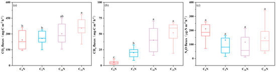 CO2 (a), CH4 (b), and N2O (c) fluxes from SFCWs at different C/N ratios during the experiment operation. Different letters (a, b and c) indicate significant differences between treatments.