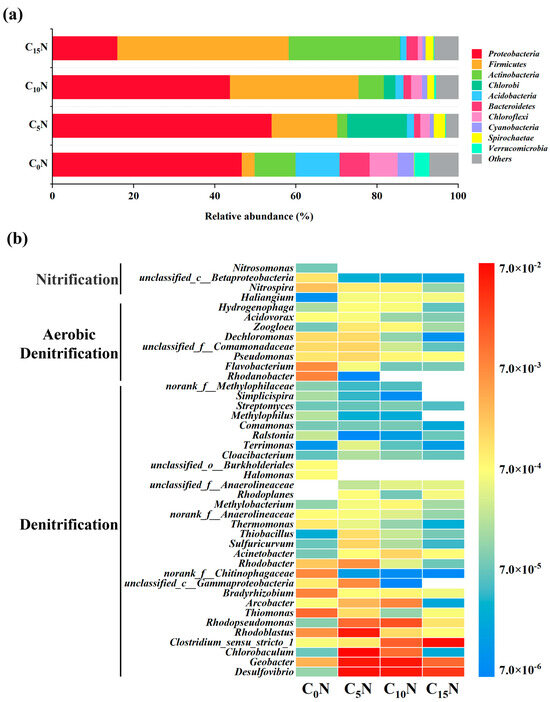 The relative abundance of wetland sediment microorganisms at the phylum level (top 10) under four influent C/N ratios is shown in Figure 4a. Proteobacteria (16.09–54.07%), Firmicutes (3.13–42.17%), and Actinobacteria (2.49–27.5%) were the three most dominant phyla in M. aquaticum SFCWs. For C0N, C5N, and C10N, the abundance of Proteobacteria and Actinobacteria was relatively similar among treatments, while for C15N, the relative abundance of Proteobacteria decreased significantly, while the relative abundance of Actinobacteria increased. The relative abundance of Firmicutes also increased, with C15N having the highest relative abundance (42.17%) of this bacterial phylum, replacing Proteobacteria (16.09%) as the most abundant in that phylum. This is in line with previous studies [39,40], which have shown that Proteobacteria is the dominant phylum in CWs, containing a variety of species involved in denitrification, CH4 oxidation, and other metabolic processes. The high relative abundance of Proteobacteria may contribute to the efficient removal of COD and TN from CWs [41,42]. On the other hand, Firmicutes have been linked to CH4 production in CWs, as they have the ability to break down volatile fatty acids (such as butyrate and propionate) into hydrogen, acetate, and carbon dioxide, which are substrates for CH4 production [43,44]. This may also explain the lower pH (Table S2) in C15N and the higher CH4 emission fluxes (Figure 3b) observed in that treatment.