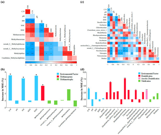 Pearson correlations (a,b) and relative importance (c,d) of environmental factors and GHG emission-associated functional microorganisms on CH4 and N2O emissions. Increase in MSE (increase in mean square error) represents the relative importance of the factor on CH4 and N2O emissions. In Figures (a,b), ***, **, and * indicate significant correlation at the 0.001, 0.01, and 0.05 levels (two-sided), respectively; in Figures (c,d), ** and * indicate significance at the 0.01 and 0.05 levels, respectively.