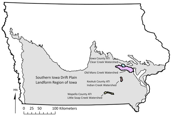 The study sites are in the state of Iowa, USA. The gray area is the Southern Iowa Drift Plain region. The colored shapes are the sub-watersheds where the ATIs were installed.