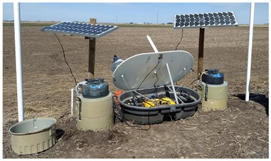 Event monitoring of the installed ATIs was conducted during the growing seasons of 2013, 2019, and 2021. At the Iowa County site, the monitoring equipment included: a local weather station; a 7.62 m deep water table monitoring well; pressure transducers for measuring the ponding depth and flow through the drain tile; a still camera to capture the extent of ponding; water content reflectometers to measure the volumetric water content; a photo-electric erosion pin for determining the amount of deposited soil; and water–sediment autosamplers to collect runoff at the inlet and outlet of the ATI [16].