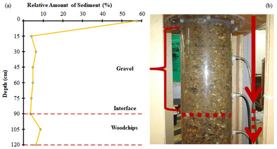 Our constant-head permeameter experiments showed that the average hydraulic conductivity of the layered gravel–woodchip was less than both of the 100% run averages because of the developed complex flow pathways, especially at different interfaces. The additional slowing of the runoff flux helped to increase the effective hydraulic retention time, thus optimizing the potential for denitrification.