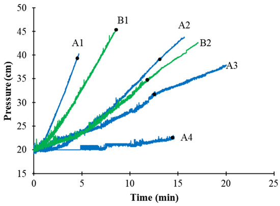 Figure 8 shows the pressure head (or water level) time series for the head box during two sets of consecutive runs where sediment was fed to the permeameter. The blue lines (i.e., lines A1–A4 in Figure 8) represent the first series and the green lines (i.e., lines B1–B2 in Figure 8) represent the second series. Each line shows the pressure head increasing once the sediment is added at time = 0, as partial clogging of the gravel–woodchip matrix causes the water in the head box to pond. The sediment feed was discontinued after the depth in the head box rose above 40 cm in order to prevent overtopping. The black dots in Figure 8 mark the time when the sediment delivery ceased. The influx of clear water continued at half the original rate until the pressure head returned to 20 cm.