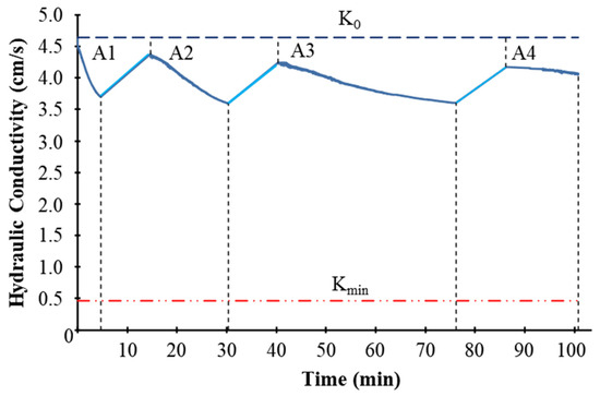 Figure 9 shows how the hydraulic conductivity changes during the first set of experimental runs (A1–A4). The periods when K decreases correspond to the periods of sediment delivery to the head box. The periods when the hydraulic conductivity has a positive slope correspond to the periods when only clean water was added.