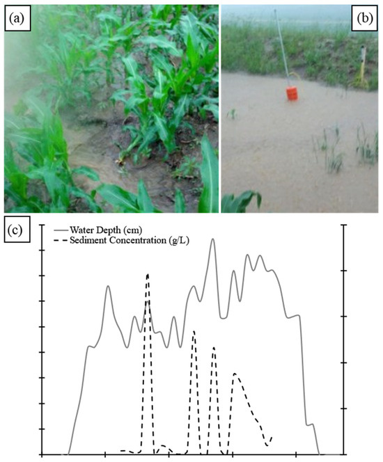 Sampled runoff event. (a) A rill that formed delivered water to the ATI. (b) Ponding near the control intake. (c) Water depth measured with the pressure transducer in the drain tile below the ATI. The maximum depth of 4.5 cm corresponds to 35.4% of the pipe cross-sectional area.