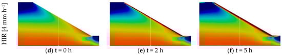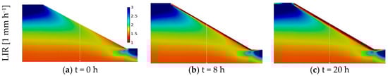 The spatial and temporal variability of LFS for the 2D silty slope simulated with the FC two-phase flow model for the LIR at (a) t = 0 h, (b) t = 8 h, and (c) t = 20 h, and the HIR at (d) t = 0 h, (e) t = 2 h, and (f) t= 5 h.