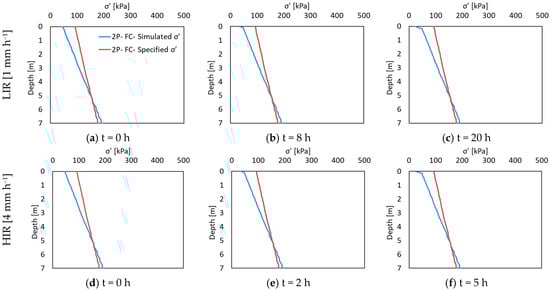 The simulated change in effective stress at cross section A of the 2D silty slope using the two-phase FC model for the LIR at (a) t = 0 h, (b) t = 8 h, and (c) t = 20 h and the HIR at (d) t = 0 h, (e) t = 2 h, and (f) t = 5 h.
