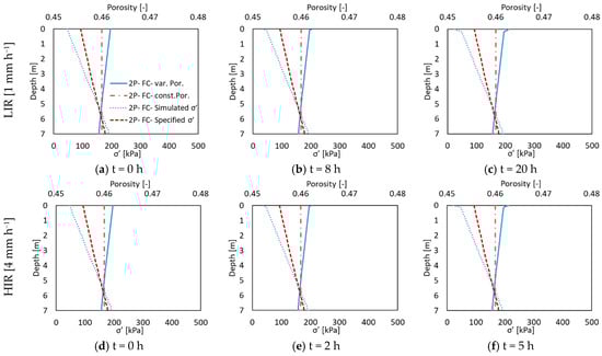 The dynamics of simulated vertical effective stress and porosity at cross section A of the 2D silty slope using the two-phase FC model for the LIR at (a) t = 0 h, (b) t = 8 h, and (c) t = 20 h and the HIR at (d) t = 0 h, (e) t = 2 h, and (f) t = 5 h.