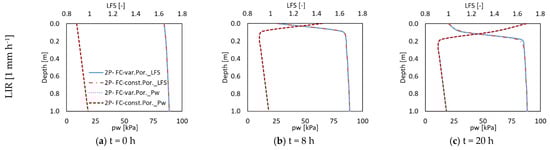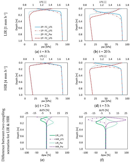 The simulated pw and LFS distribution at cross section A for the 2D silty slope using the fully coupled two-phase and Richards’ models (2P-FC and 1P-FC, respectively) with the LIR at (a) t = 8 h, and (b) t = 20 h and the HIR at (c) t = 2 h, and (d) t = 5 h. The differences between the two model implementations for low- and high-intensity rainfall are shown in panels (e,f).