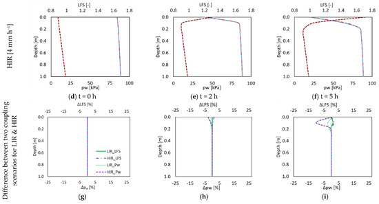 The simulated pw and LFS distribution at cross section A of the 2D silty slope using the two-phase fully coupled (2P-FC) model with variable and constant porosity for the LIR at (a) t = 0 h, (b) t = 8 h, and (c) t = 20 h and the HIR at (d) t = 0 h, (e) t = 2 h, and (f) t = 5 h. The difference between the two model implementations for low- and high-intensity rainfall are shown in panels (g–i).