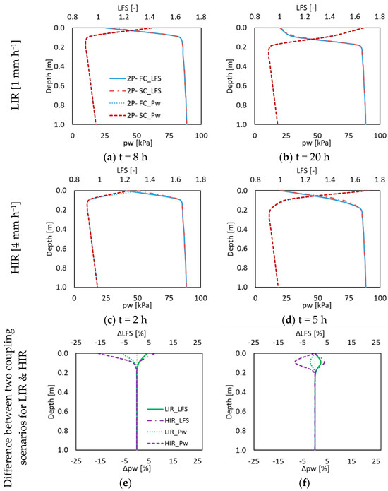 The simulated pw and LFS distribution at cross section A for the 2D silty slope using fully and sequentially coupled two-phase flow models (2P-FC and 2P-SC, respectively) with the LIR at (a) t = 8 h and (b) t = 20 h and the HIR at (c) t = 2 h and (d) t = 5 h. The differences between the two model implementations for low- and high-intensity rainfall are shown in panels (e,f).