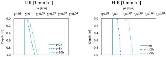 The results from comparing the fully coupled two-phase and one-phase flow models indicate a more significant disparity between these two implementations than the impact of simplifying poroelasticity or employing different coupling strategies. These differences in Figure 6 are primarily attributed to the influence of constant pore air pressure (pa) in the one-phase flow model based on Richards’ equation. In a two-phase flow system involving water and air, the air must move or exit the domain during rainfall infiltration. Consequently, the downward progression of water is impeded by elevated pore air pressure, resulting in reduced flow and a slower increase in pw. This also explains the enhanced water accumulation near the surface over time, leading to higher pw near the surface in the two-phase flow model. To substantiate this, we analyzed the development of pore air pressure (pa) during both low- and high-intensity rainfall events. Figure 8 illustrates the rising trend of air pressure with infiltration. As depicted, air pressure increases with depth and infiltration. This pattern arises from soil compaction and the displacement of air from shallower layers due to increasing depth and infiltration, respectively. In the case of low-intensity rainfall, air movement is less restricted and can be released from the area, resulting in a less pronounced increase in pa with infiltration. The steeper curve for low-intensity rainfall represents the initially dominant influence of soil compaction, which is more prominently affected by infiltration during high-intensity rainfall.