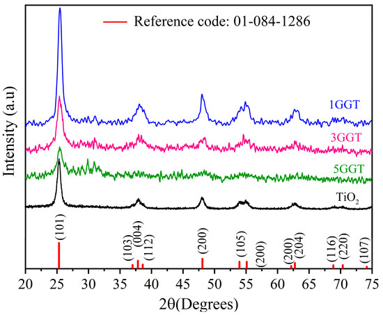 X-ray diffraction diagram of the composites 1GGT, 3GGT, 5GGT, and pristine TiO2.