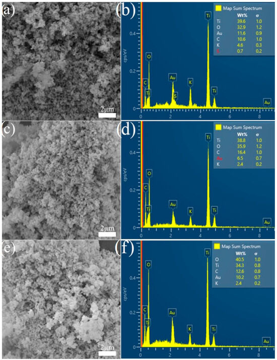 The evaluation of the material’s morphology was carried out using scanning electron microscopy (SEM). Figure 3 shows the material’s morphology; the TiO2 is distributed uniformly and in scales [38,39] and the EDS results. The granules can be attributed to the formation of TiO2 nanoparticles, characteristic of the anatase phase [40,41]. 1GGT presented a more excellent distribution of TiO2 particles and a larger crystalline size, a fact that is related to the greater surface area according to the BET and XRD results. The titanium (Ti) peaks demonstrate that the composite was successfully synthesized because the Ti element is present in all synthesized materials.