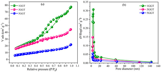 Analyzing the isotherm in Figure 4a, 1GGT presents classification type IV, according to the International Union of Pure and Applied Chemistry (IUPAC). The existence of a mesoporous structure with pores between 2 and 50 nm [50], confined by Figure 4b, shows the distribution of pores and their diameter between 2.9 nm and 23.9 nm. The adsorption process in solid and mesopore substances is generally accompanied by a hysteresis loop, so for all materials, this loop would be type H3 with slit-type pores [38,51]. The 3GGT and 5GGT also have type IV classification, but they have almost no hysteresis loop, which may be related to the smaller pore size [17,38].