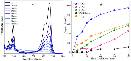 (a) Spectral variation in MB dye irradiated with 1GGT sample and (b) degradation kinetic curves of the MB solution irradiated using 1GGT, 3GGT, and 5GGT solutions under UV light.