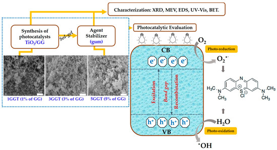 The path of a catalytic photoreaction is summarized in the following steps: (i) photoexcitation with UV light under TiO2/GG to generate charge carriers in the CB and VB bands, (ii) production of reactive oxygen species responsible for MB degradation, and (iii) oxidation-reduction reactions involving the ●OH in the breakdown of the dye and possible mineralization of the pollutant [4,10]. Figure 7 simplifies the degradation mechanism involving the TiO2/GG/dye system.
