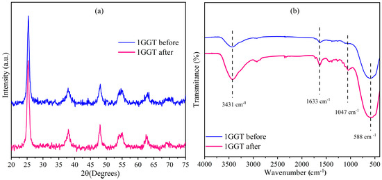 (a) XRD diffractogram and (b) FTIR spectra of the 1GGT photocatalyst before the photocatalyst test and after the third cycle of MB degradation.