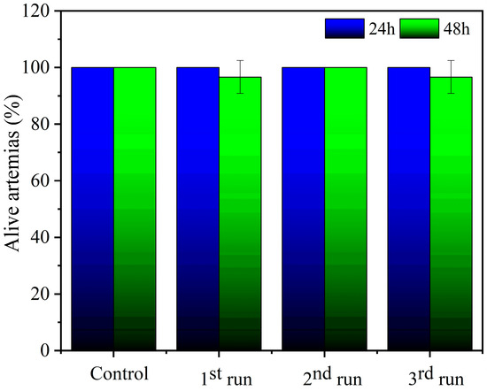 Microcrustaceans were cultivated for 48 h in synthetic saline solution under lighting and oxygenation, as described in Araujo et al. [24]. The seawater solution, with a concentration of 38.0 g L−1, was prepared with the salts: calcium chloride, magnesium chloride, magnesium sulfate, and sodium bicarbonate. The ten nauplii were added to a solution containing irradiated MB (used in reuse test) and synthetic saline in a ratio (1:1), and their mortality rate was evaluated after 24 h and 48 h. The control solution was only the synthetic saline solution to evaluate its quality.