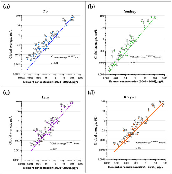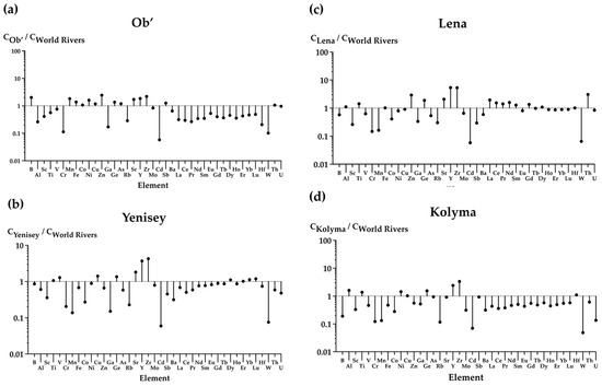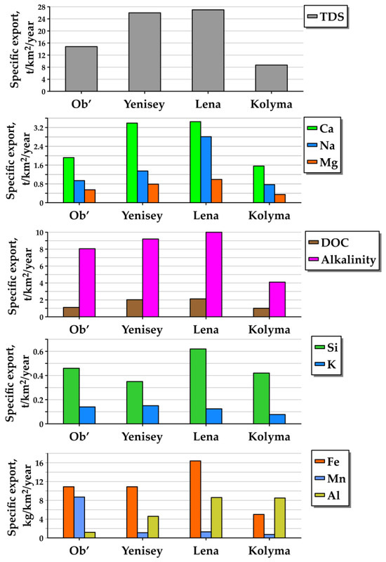 Gordeev, V.V.; Pokrovsky, O.S.; Zhulidov, A.V.; Filippov, A.S.; Gurtovaya, T.Y.; Holmes, R.M.; Kosmenko, L.S.; McClelland, J.W.; Peterson, B.J.; Tank, S.E. Dissolved Major and Trace Elements in the Largest Eurasian Arctic Rivers: Ob, Yenisey, Lena, and Kolyma. Water 2024, 16, 316. https://doi.org/10.3390/w16020316