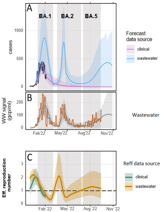 The effective reproduction number during the BA.5 wave (July–September 2022) showed a weaker increasing phase of the wave when compared to the BA.2 and BA.1 driven waves, which suggests a potential decline in severity and/or transmissibility for BA.5 (transmissibility can be affected by intrinsic feature of the virus or by external forces, like public health interventions) or lower fecal shedding for this variant. While it is possible to estimate the trend of the virus using wastewater data, it is more challenging to assess the change in virulence for different SARS-CoV-2 lineages using this data source alone. Interestingly, a study has shown that there is no difference in severity for BA.5 compared to BA.1 infections [23]. Another study has shown that BA.5 infections were associated with an 18% higher risk of hospitalization compared to BA.1 and BA.2 [24]. Nevertheless, the effects of vaccination on the shedding rate are yet to be understood. There is evidence that previous infection and vaccination strongly protected against severe cases [23]. Increased hospitalization during the BA5 wave might also be responsible for lower wastewater-derived Reff because patients in intensive care units contribute little or no waste to wastewater treatment plants, as most of the time, they could be bedridden. Similarly, booster vaccinations and previous infection might be responsible for the lower Reff during BA.5 compared to BA.1 and BA.2.