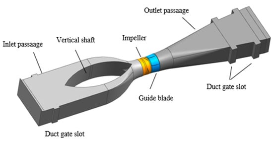 The computational framework encompasses a low-head vertical pump, wherein each discrete pumping station is characterized by a designated volumetric flow rate of 14 m3/s and is equipped with a pump impeller featuring a diameter of 2400 mm, comprising three impeller blades and five guide vanes. The comprehensive computational domain of the model encompasses the inlet passage, impeller, guide vane, and outlet passage. Figure 1 presents a schematic representation of the vertical shaft pump’s structural configuration.