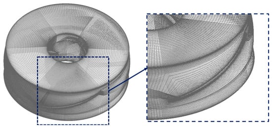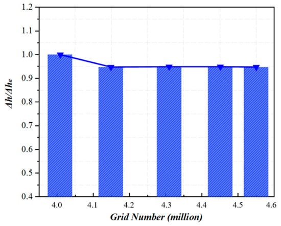 To account for both computational efficiency and precision in the subsequent numerical simulation, this study employed the ICEM CFD software within the ANSYS 19.2 to construct a hexahedral mesh computational model of the impeller. Figure 2 illustrates the mesh diagram of the impeller, while the remaining components of the pump utilize the Mesh software on the ANSYS platform to formulate a tetrahedral mesh. To ensure the precision of numerical simulation calculations, the grid count for the impeller is incrementally augmented, thereby optimizing computational resources without compromising grid quality. The grid independence results are shown in Figure 3. The analytical findings revealed that with an aggregate quantity of approximately 4.5 million power grids, the range of variations in hydropower loss remained within ±5%, thereby satisfying the criteria for the independence testing of the power grid.